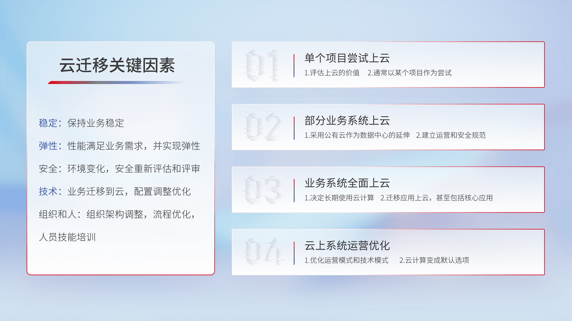 结合实际业务,,,从规划设计、、云平台选型、、、云原生改造、、、、数据迁移、、、集成交付,,迁移全过程为客户识别最佳上云路径,,,做好风险识别管理,,,,设计网络架构、、身份权限、、、、安全审计合规、、、操作审计、、、、日志审计、、、监控告警策略、、多站点容灾设计等,,,,对云上基础设施进行整体规划,,,,提升IT治理水平,,,,以满足弹性、、、、高可用、、、高性能的需求。。