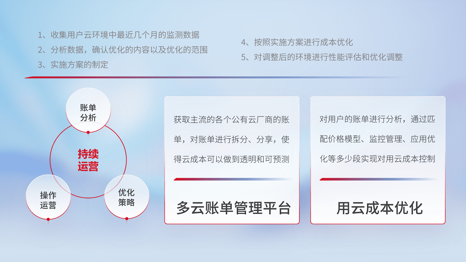通过多云纳管,,,以统一的资源数据模型把客户的云资源进行抽象和封装,,,进而实现对多云资源的统一操作,,,保障云资源管理的可靠性、、稳定性与可用性。。。。量身定制化运维内容,,,,配置、、、开发运维、、补丁管理、、备份、、监控、、、、认证和访问管理、、、、审计和日常巡检等,,,,保障在用云过程中的可靠度,,,,稳定度以及高可用率。。。